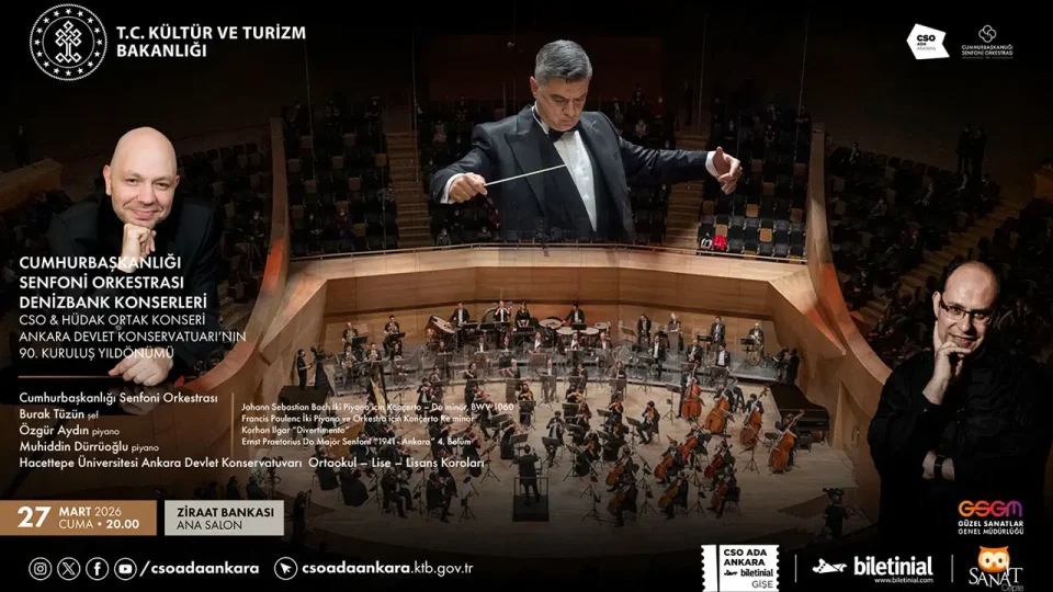 Konser, Ankara Devlet Konservatuvarı’nın 90. kuruluş yıl dönümü etkinlikleri çerçevesinde düzenlenirken, orkestrayı şef Burak Tüzün yönetecek. Gecede piyanistler Muhiddin Dürrüoğlu ve Özgür Aydın solist olarak sahne alacak.
